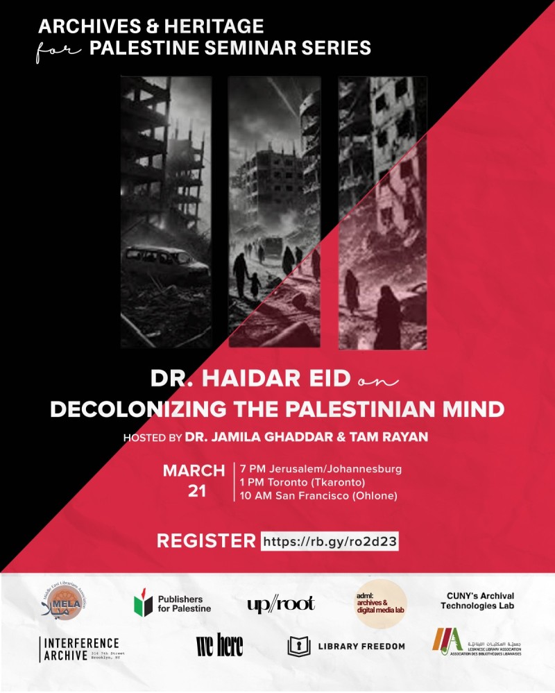 Live from South Africa, Dr. Haidar Eid joins us on Friday, March 21 for the 7th installment of the Archives & Heritage for Palestine series hosted by Dr. Jamila Ghaddar and Tam Rayan that includes a showing of the short film, Returning to Zarnouqa. As a leading Palestinian scholar at Al-Aqsa University in Gaza, Dr. Eid has been outspoken in advocating for liberation that is uncompromising on the Palestinian right to self-determination, return, and equality. This session draws from Dr. Eid’s recent book, Decolonizing the Palestinian Mind (2025), an urgent and uncompromising call for Palestinian liberation from the river to the sea, grounded in a fiery rejection of Orientalism and normalization, and a profound engagement with the South African experience. In the words of Ronnie Kasrils, South African anti-apartheid icon and former liberation fighter, “This book is an impassioned call for breaking down the constraints of the Oslo surrender—a strategy imposed from above that has led to a dead end and worse. It is said that dynamite comes in small packages. This book offers ideas that will make the earth shift within historic Palestine, the Middle East, and beyond.” In offering an insurgent counter-narrative, Dr. Eid speaks back to the empire in the grand tradition of deconstructing the oppressor’s narrative vis-a-vis Frantz Fanon and Edward Said. This seminar engages Dr. Eid in what this counter-narrative approach means for how we archive for liberation and return.