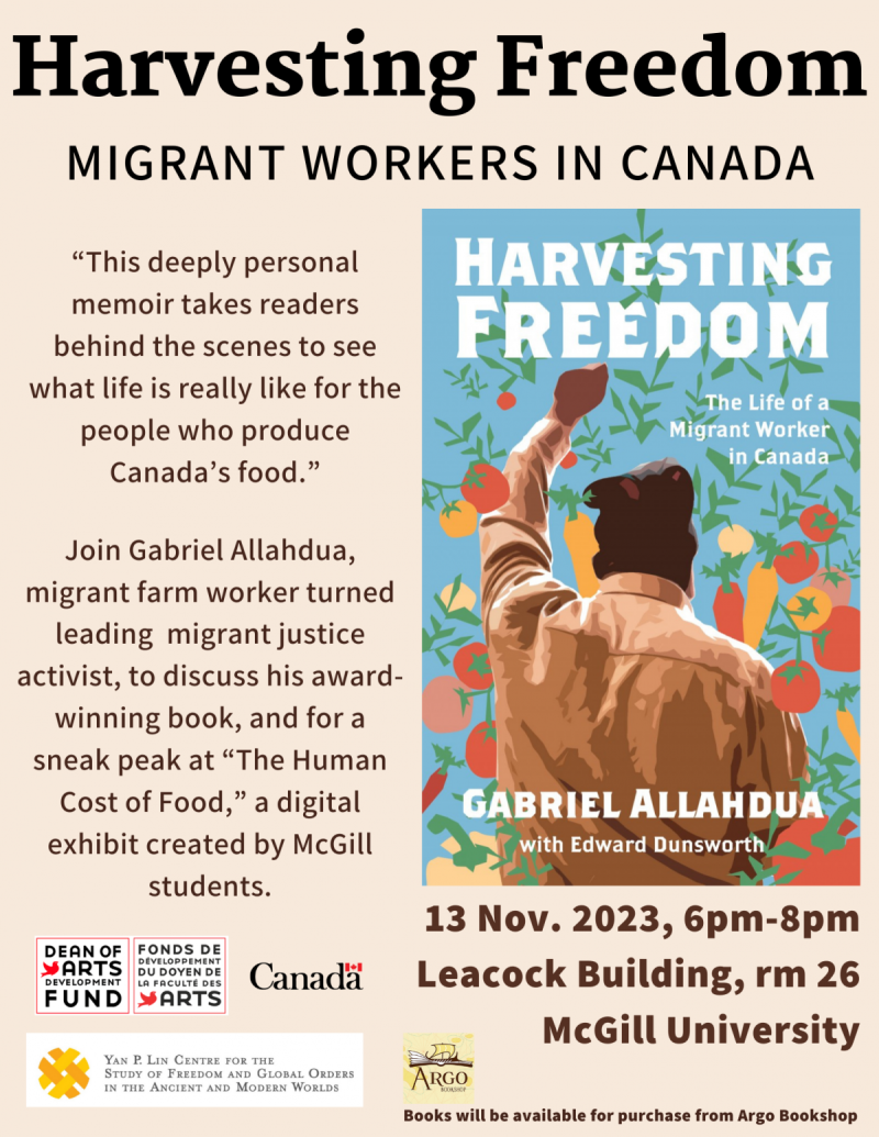 Join Gabriel Allahdua, migrant farm worker turned leading migrant justice activist, to discuss his award-winning book, Harvesting Freedom: The Life of a Migrant Worker in Canada.